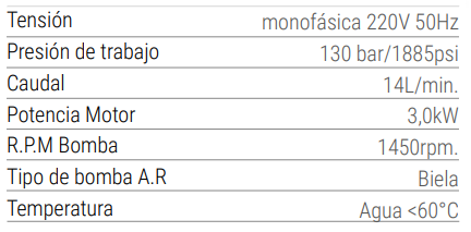 Modelo Luster 130.14 monofásica agua fría, de gran potencia y durabilidad, para trabajos que requieren uso diario. Motor potente de 3,0 HP da una constante presión para el trabajo. Estructura en metal pintado con cubierta de acero inoxidable. Bomba con cigüeñal de 1450 rpm, válvula de seguridad y manómetro para un mejor control de la presión.