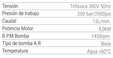 Modelo Luster 200.15 trifásica agua fría, de gran potencia y durabilidad, para trabajos que requieren uso diario. Motor potente de 5,3 HP da una constante presión para el trabajo. Estructura en metal pintado con cubierta de acero inoxidable. Bomba con cigüeñal de 1450 rpm, válvula de seguridad y manómetro para un mejor control de la presión.