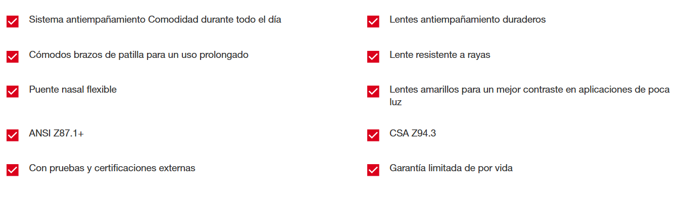 Nuestras gafas de seguridad con sistema antiempañamiento están diseñadas para brindar comodidad durante todo el día. Estas gafas de protección poseen lentes con un sistema antiempañamiento para mantener una visión clara en las condiciones más difíciles y un revestimiento en los lentes para disminuir las rayas. Las gafas de seguridad con sistema antiempañamiento MILWAUKEE® poseen unos cómodos brazos de patilla diseñados para un uso prolongado. Estas gafas de protección con sistema antiempañamiento también cuentan con un puente nasal flexible integrado que aumenta su comodidad. Los lentes ahumados amarillos aumentan el brillo ambiental aparente, por lo cual son ideales para trabajar con poca luz, en tanto los lentes grises son óptimos para la transición entre trabajos en interior y en exterior.