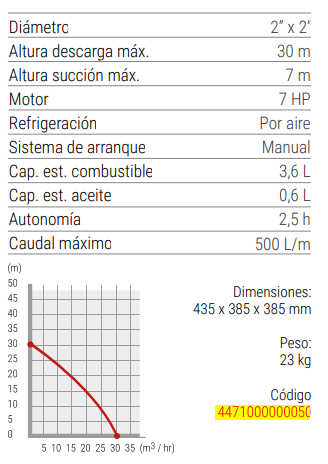 Motobomba a gasolina semi profesional 2” x 2” centrífuga. Fiable, eficiente y robusta.