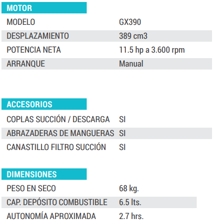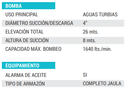 • La motobomba WT40 pertenece a la línea de equipos para uso en Aguas Turbias, cuenta con una alta capacidad de bombeo de 1640 lts/min, con un diámetro de 4’’ tanto para la succión, como para la descarga.