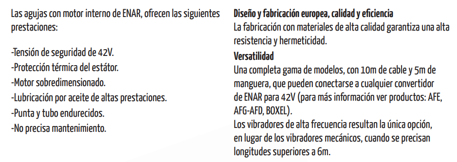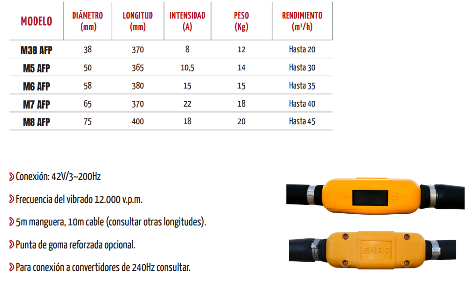 Vibrador de hormigón de alta frecuencia, marca Enar. Accionado por convertidor AFE o BOXEL. Interruptor robusto y estanco, protegido con doble junta de caucho resistente a la abrasión y al uso continuado.