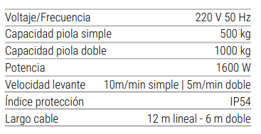 Equipado con limitador de sobrecarga (Final de carrera). Posee un comando tipo botonera que permite una mayor facilidad en la operación. Con un interruptor con freno de emergencia y protector térmico que le entrega una mayor seguridad al equipo y al operario.