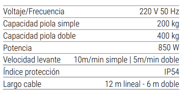 Equipado con limitador de sobrecarga (Final de carrera). Posee un comando tipo botonera que permite una mayor facilidad en la operación.