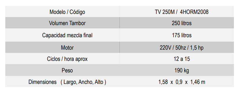 • Capacidad de mezcla 160 litros.